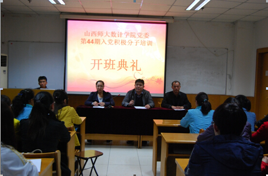 4月8日晚6:40,数计学院在科学会堂A710举行第44期入党积极分子培训班开班仪式。院党委副书记、学工组组长张珂,院党委委员、团委书记陈立记,院办副主任、学生一支部书记贾静及全体入党积极分子参加了本次开班仪式。仪式由贾静老师主持。