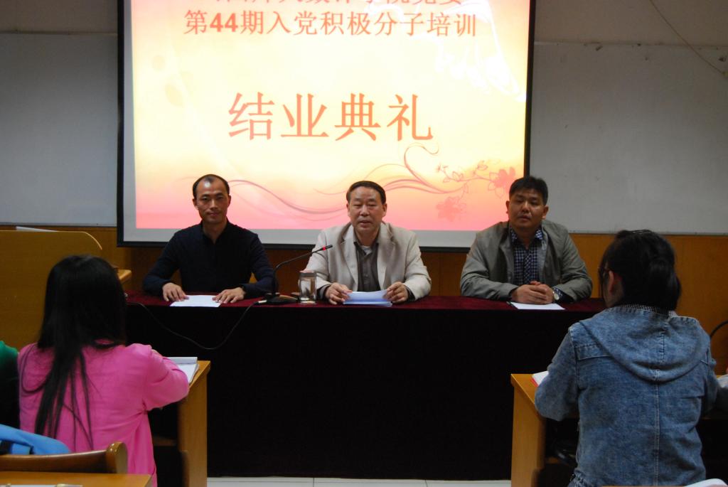 首先,院党委副书记、学工组组长张珂对本次培训作了总结:此次培训组织严密,内容丰富,安排合理,注重理论与实践相结合,各位学员态度端正,学习积极,培训取得良好成效。他对本次培训的组织工作人员及各位讲师表示由衷的感谢,并衷心地祝贺各位学员顺利结业,早日成为一名优秀的共产党员。之后,院党委书记王成喜向同学们表达出了深深的期许与赞扬,希望每个学员都能严格要求自己,在行为和行动上真正入党,将培训中学到的知识落实到实践中去。最后,结业典礼在大家洪亮高亢的歌声中圆满结束。