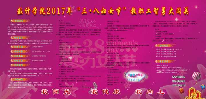 为庆祝三·八妇女节,丰富我院女教职工文化生活,展示我院女教职工的风采,让全体女教职工过一个健康、快乐、温馨的节日,我院工会于2017年3月4日组织全体女教职工进行“三·八妇女节智勇大闯关”活动。校工会副主席亢健和校工会老师杨柳青出席了闯关活动。数计学院全体女教职工参加了本次活动,部分男教职工到现场为闯关活动捧场。