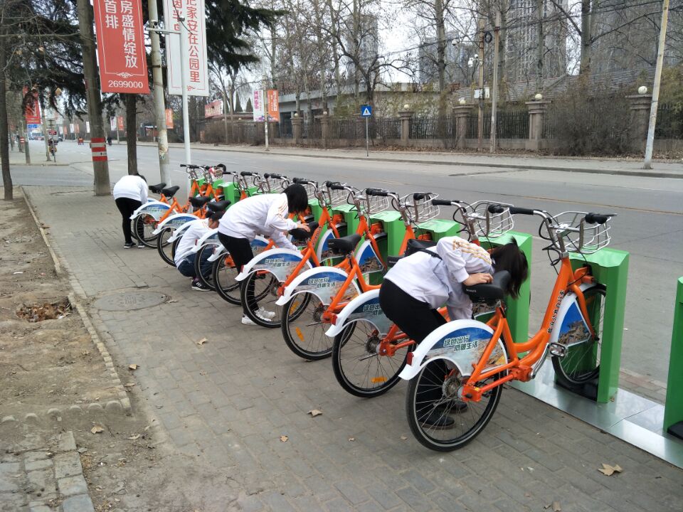 志愿者分别对尧都公园、临汾市人民政府、美特好超市、澳门网投官方网站体育学院等4处站点的公交自行车、驻锁以及停靠设施进行了全面的清洁。志愿者们带着毛巾和水等清洁工具,在不影响市民租赁的情况下,对自行车进行仔细清洗。大家相互合作,合理分工,积极配合,从车把手到坐垫,从车身到车轮,从自行车到锁桩,同学们用心擦洗,不放过任何一个卫生死角。寒风凛冽中,志愿者们毫不退缩,积极热情地投入到清洁工作中,现场忙碌不已。经过一下午的努力,公共自行车站点的公共自行车焕然一新。同学们的工作不仅是让周边的公共自行车变得洁净,更向社会传达一种正能量:爱护公物,奉献社会,是每一个公民应尽的义务。