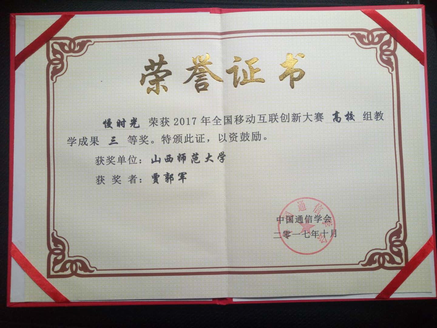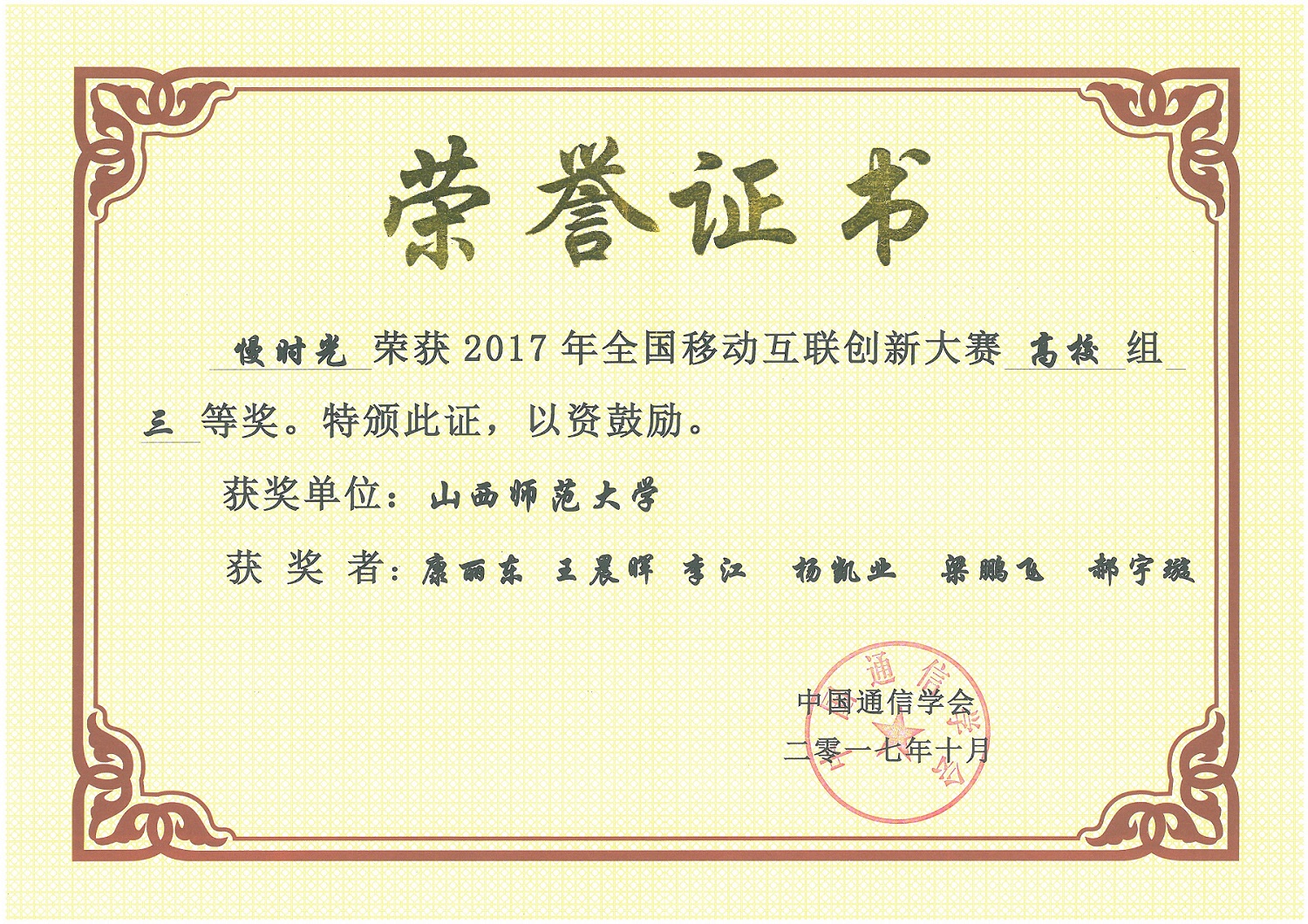 10月27日——29日,2017全国移动互联创新大赛在北京落下帷幕。数计学院“慢时光”团队作为我校参赛的唯一团队,喜获高校组“三等奖”荣誉,这也是我校首次参加这一全国顶级赛事。