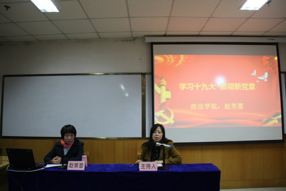 11月15日晚7时,数计学院在科学会堂A710会议室举办学习宣传贯彻党的十九大精神报告会,政法学院副院长赵笑蕾教授应邀作专题报告,院领导和全院党员师生近百人聆听了报告。报告会由院党委书记郝红霞主持。