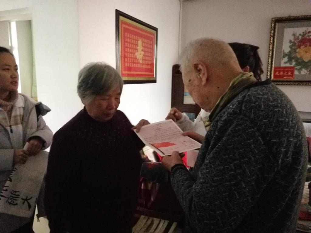 在干休所负责人的带领下,志愿者们分组进家户慰问老兵们,送上亲手制作的贺卡以及书法作品,聆听他们讲述抗战故事,重温民族记忆。老兵们虽年事已高,却精神饱满、声音洪亮地为学生们讲述那个烽火年代的故事,英勇无畏的精神感染了大家,也让所有人深刻地认识到当下幸福生活的来之不易。