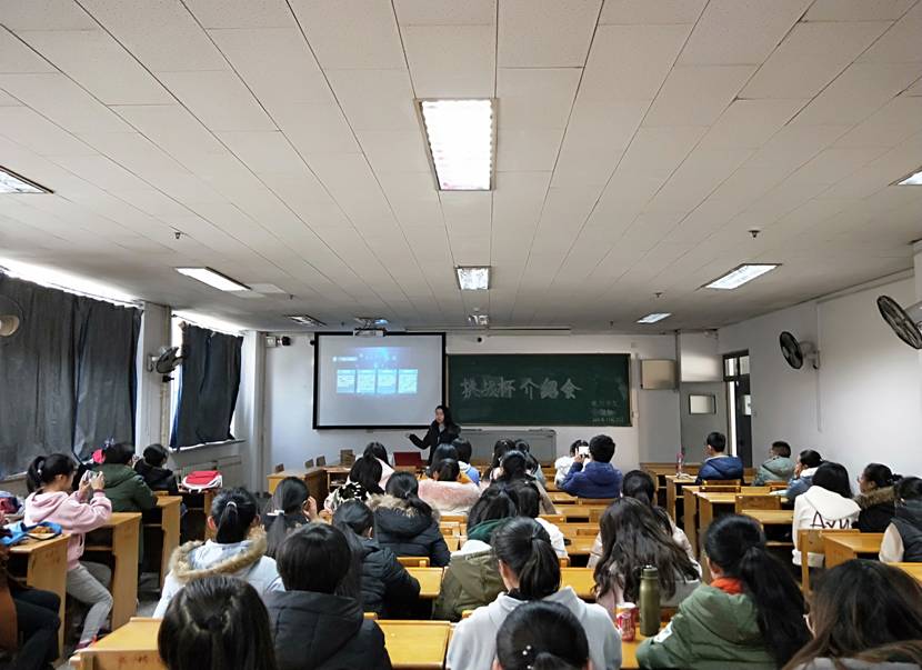 尚小芹同学详细介绍了参加挑战杯的比赛章程,并分析了“挑战杯”项目备赛过程中的重点难点。她具体解释了如何选题、如何实施、如何准备材料及答辩,动员大家积极创作优质的“挑战杯”申报书及竞赛作品书。她以近两年的特等奖参赛项目为学习案例,指出在挑战杯作品中要充分体现选题的科学性、前瞻性和现实意义。