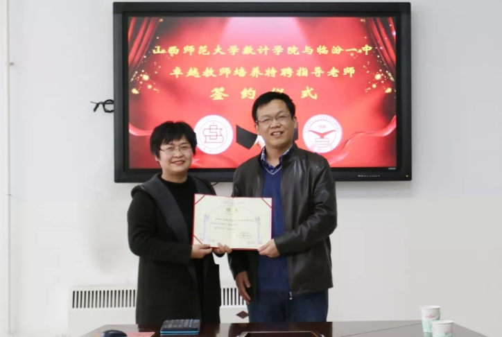 临汾一中陈建平副校长对参会的数计学院师生表示欢迎,并对我院实习学生表达了期许。会后,史建红院长向临汾一中三位教师颁发了聘书。