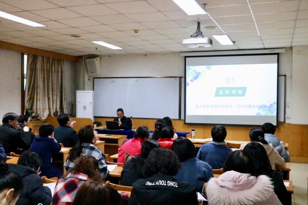 其次,院党委副书记、学工组组长杨亚东以《学风诊断报告》为题,从学院学风向上向好的七种表现,亟需解决的六个问题以及相应的措施三方面,向参会教师反馈了学情。