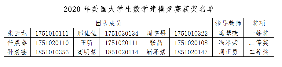 近日,2020年美国大学生数学建模竞赛(MCM/ICM)成绩揭晓,我院组建8支参赛队伍,斩获一等奖(Meritorious Winner)1项,二等奖(Honorable Mention)2项。