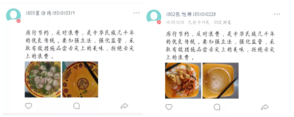 在活动中每位同学每餐需要上传餐前食物图及餐后光盘图,规定在14天的时间里,每天在打卡圈打卡一次即可成功完成光盘行动。活动期间,同学们坚持每日打卡,使光盘成为一种生活习惯。节约每一粒粮食的理念深入同学们的心中。