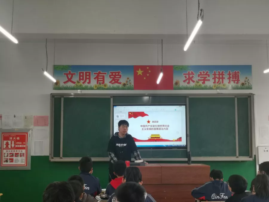 4月1日,学生第三党支部党员代茂林在清徐县城初级中学带领271班的学生们学习党史知识,并结合疫情和国际形势,讲述战“疫”体现的中国共产党的领导优势及党的统一领导下集中力量办大事的制度优势。