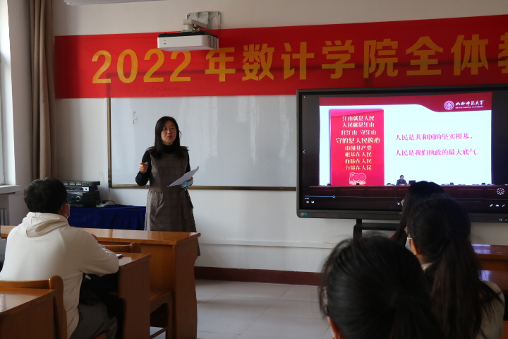 2月25日下午3时,数计学院召开“开学第一课”专题学习会议,各党支部书记和辅导员老师在学院会议室集中收看录播视频,院党委书记郝红霞讲党课。她带领大家重温习近平总书记五年来三次视察山西重要指示精神,梳理讲解“开学第一课”讲授的四个方面内容,深刻感受党的领袖对老区人民的深切关怀和党中央对山西工作的高度重视,深入学习习近平总书记实事求是、求真务实的工作作风。