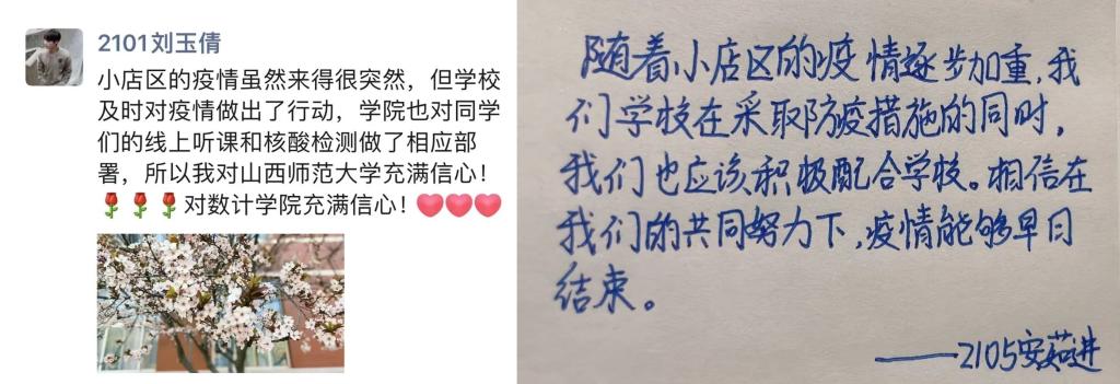 我院紧跟学校安排部署,院领导、辅导员、教师闻令而动,把关心关爱汇聚到一线,成为疫情防控的“铁军”一员,配合暖心的”大白”一起为师生安全保驾护航。团学干部、党员、青年团员发挥先锋作用,积极参与核酸检测现场的志愿服务工作,在教职工餐厅和学生餐厅维持秩序、服务师生就餐。线上线下教学有条不紊进行,行政人员从细从实落实各项工作,数计学子听从学校指挥,团结有序,共克时艰,共渡难关,彰显了作为师大人的责任与担当。在这个“倒春寒”的特殊时期,每个数计人都在用自己的行动温暖着师大。