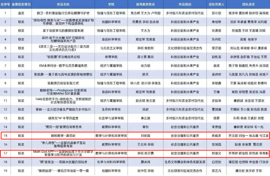 本次竞赛设科技创新和未来产业、乡村振兴和农业农村现代化、生态文明建设和绿色低碳发展、文化创意和区域交流合作、社会治理和公共服务5个组别,共吸引全省53所高校和中职院校推报参赛作品868件,最终303件作品入围决赛。经过激烈角逐,我院参赛作品《翻转数学——趣印刷》、《Math God APP互联网视域下中小学数学智慧学习软件的研究与开发》2项作品荣获铜奖。