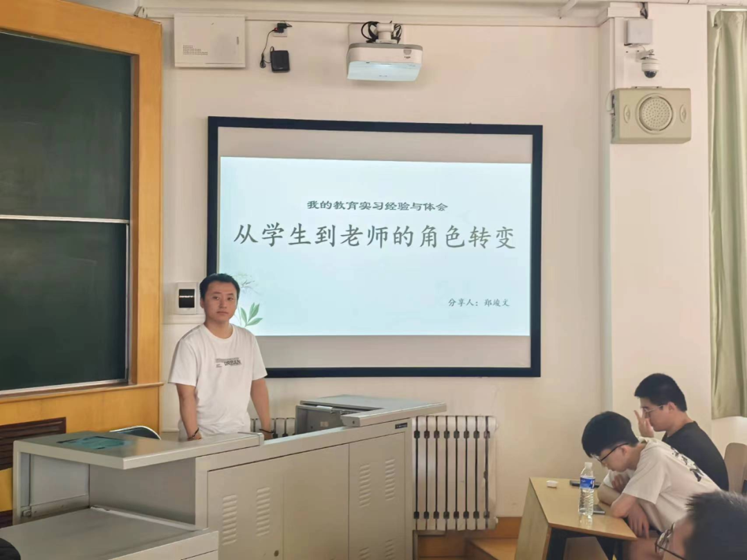 同时,优秀实习生代表郑竣文同学给同学们分享了自己实习经验,做了“从学生到教师的角色转变”的报告,郑竣文同学从角色转变、实习注意事项、班主任工作、教学工作和实习感悟五个方面跟大家做了分享。