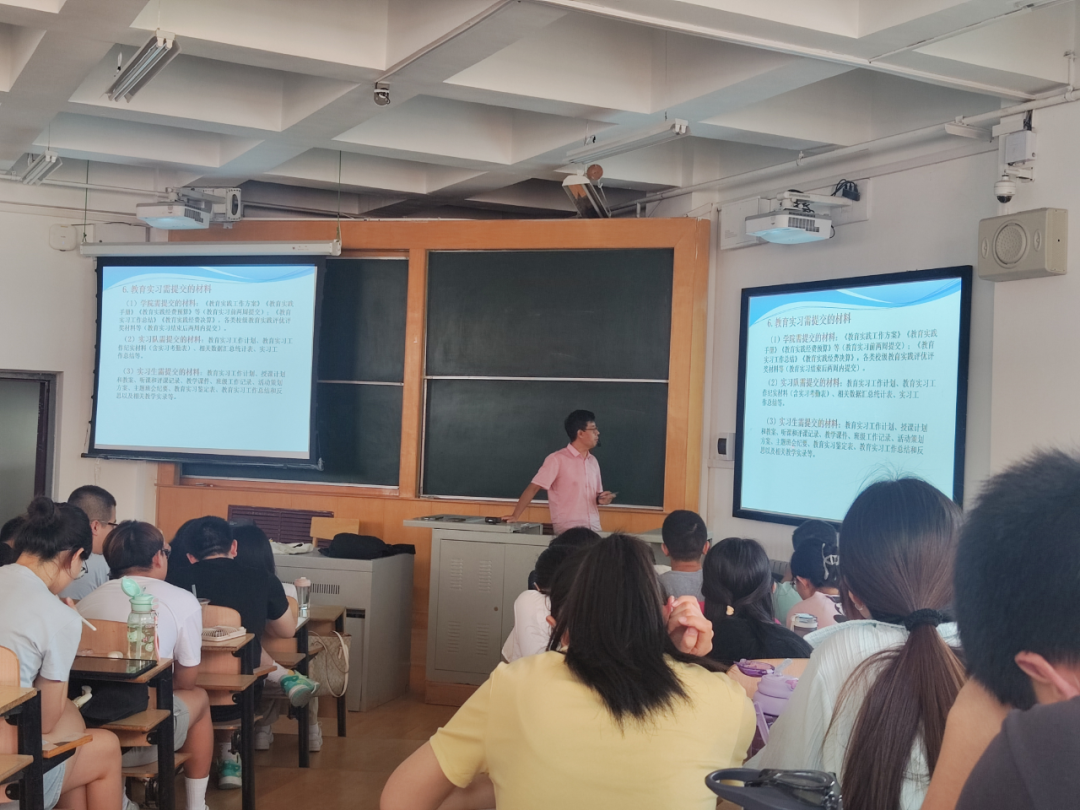 为进一步做好2021级数学与应用数学专业和2021级计算机科学与技术专业2024年下半年实习工作,帮助学生明确实习意义,2024年7月5日,我院在南校区4310教室召开实习动员大会并开展岗前培训工作。我院副院长李璞金教授出席动员大会,本科师范生实习工作负责人王栋老师主持实习动员大会并进行岗前培训工作,2021级数学与应用数学专业免费师范生和2021级计算机科学与技术专业学生参加实习动员大会和岗前培训工作。