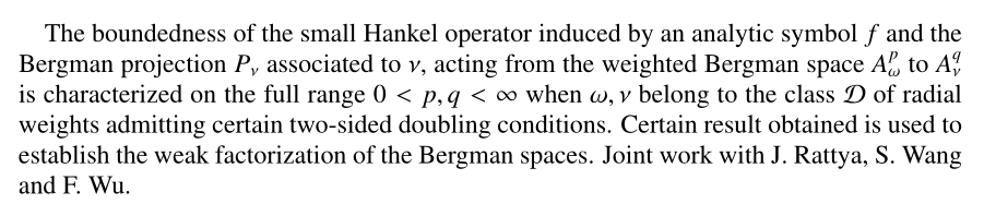 报告题目:Small Hankel operators between weighted Bergman spaces with application to weak factorization