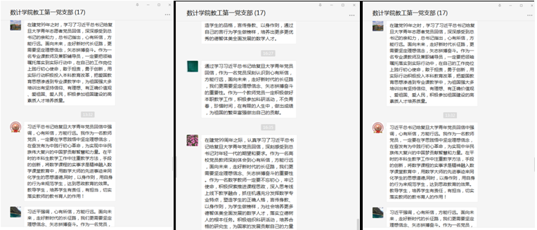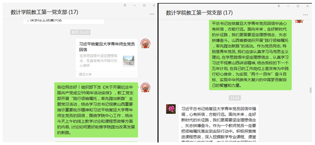 会后,同志们在支部群里,围绕习近平总书记的回信,结合我校的课堂思政改革纷纷发言,表示要在自己的工作岗位上,践行领袖嘱托,率先蹚出新路,为社会培养更多德智体美全面发展的数学人才,落实立德树人的根本任务。