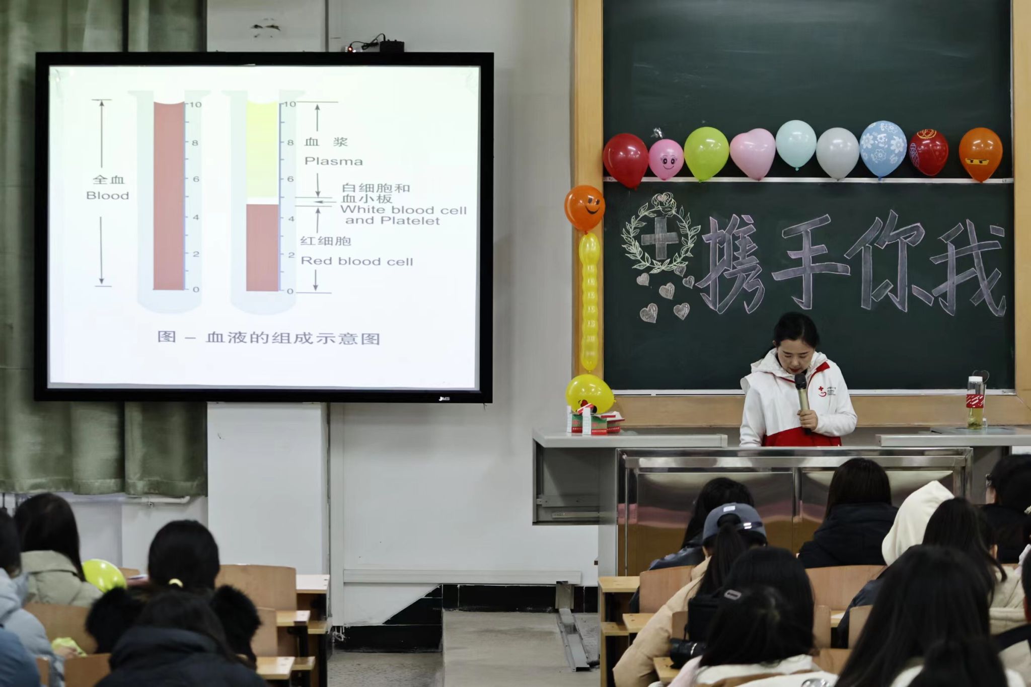 接着,太原市血液中心机采科张丽霞详细介绍了无偿的献血发展历程以及相关知识。她强调了无偿献血的重要性,并呼吁大家积极参与无偿献血,为社会贡献自己的一份力量。讲解结束后,同学们就自己的疑惑进行提问,张丽霞为同学们一一解答。
